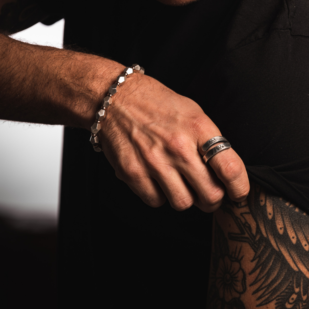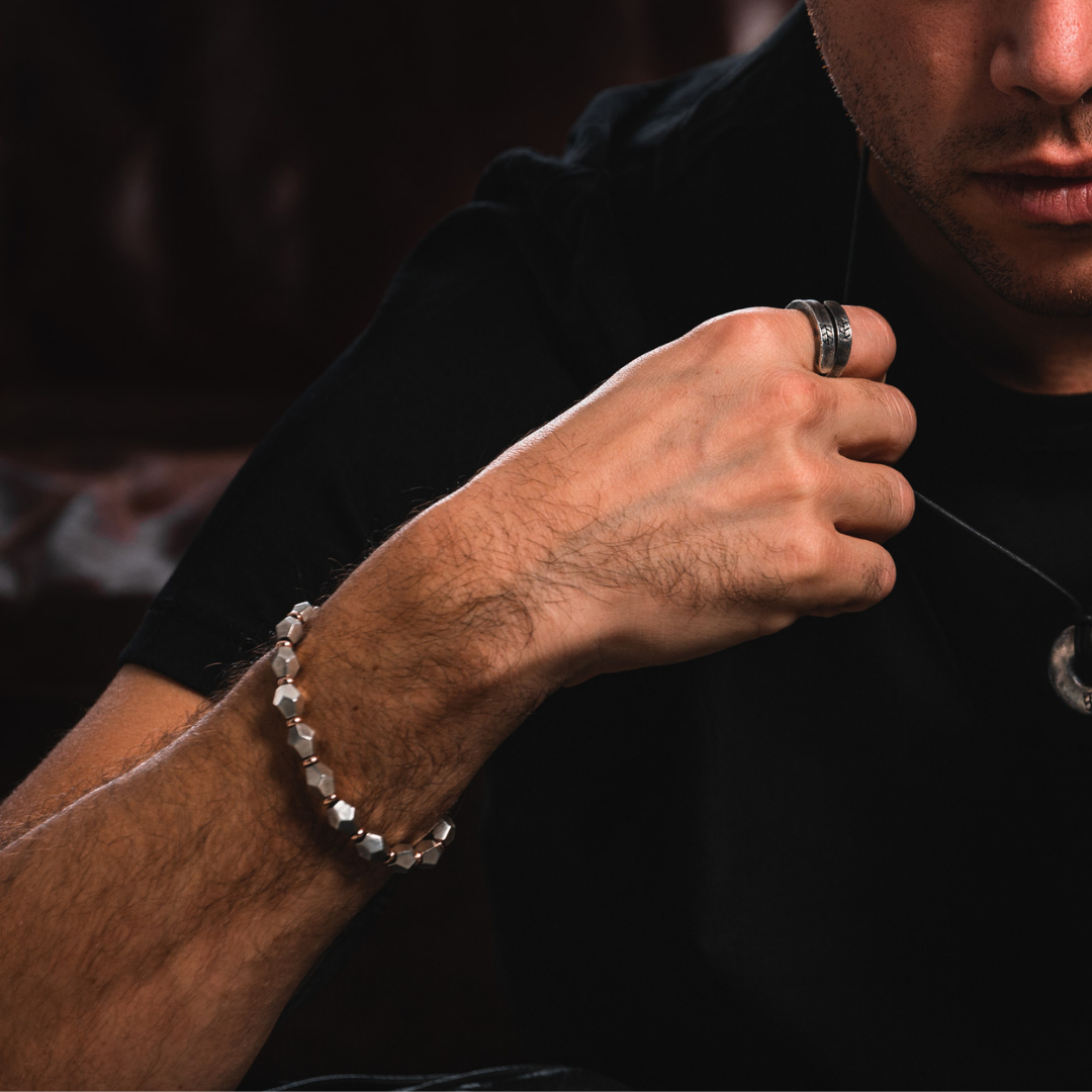 Silver bracelet, interspersed with rose gold rings.